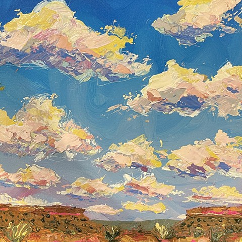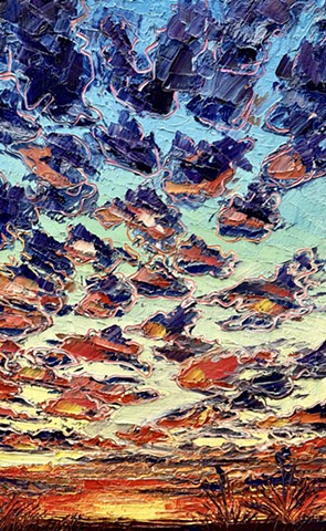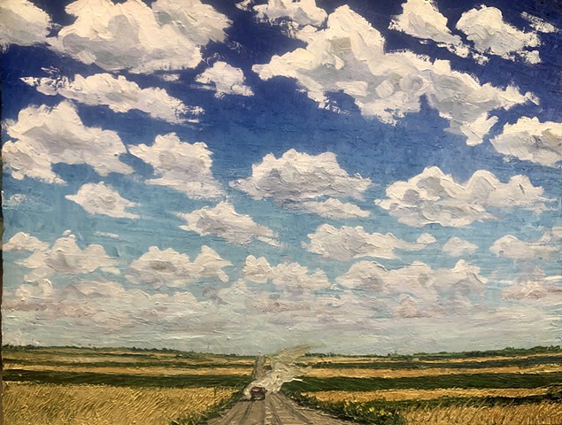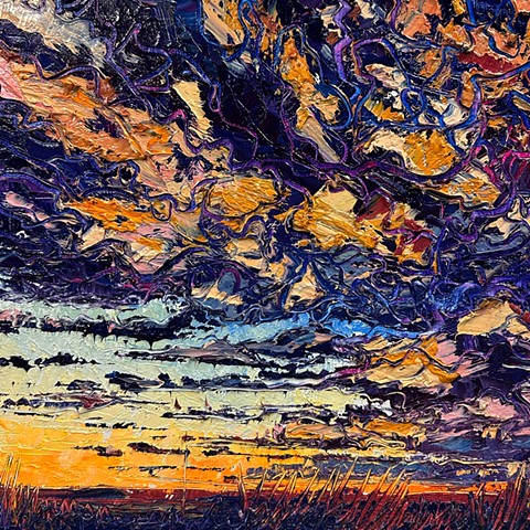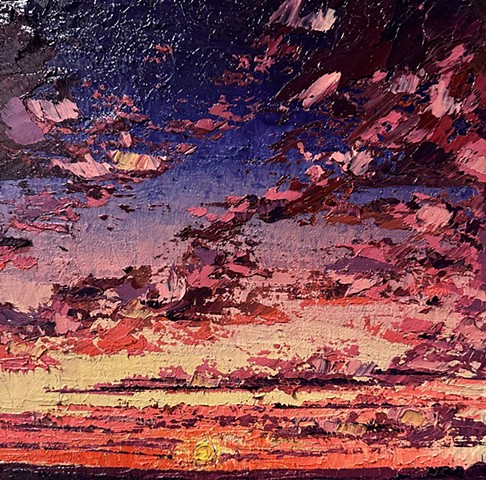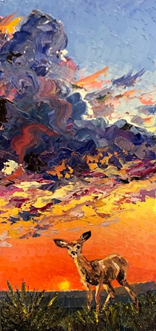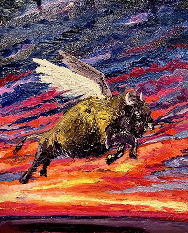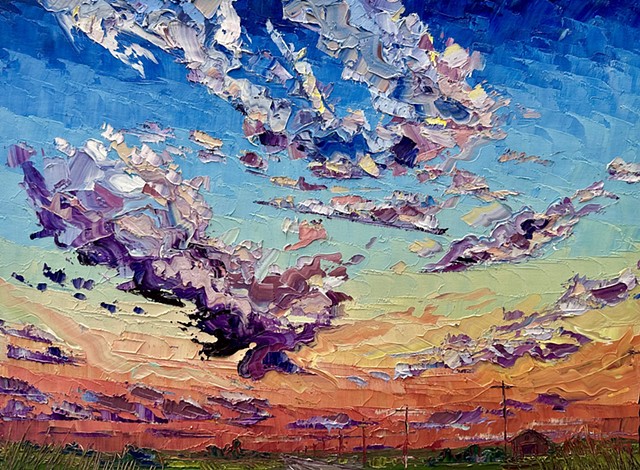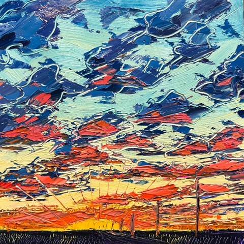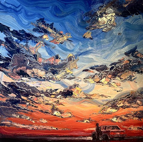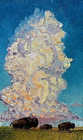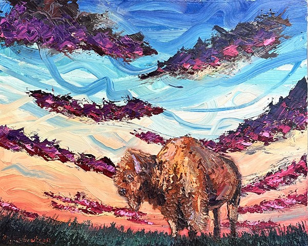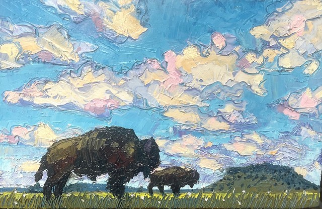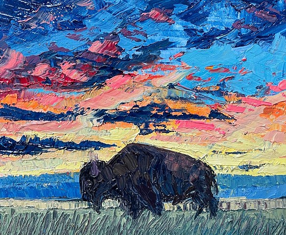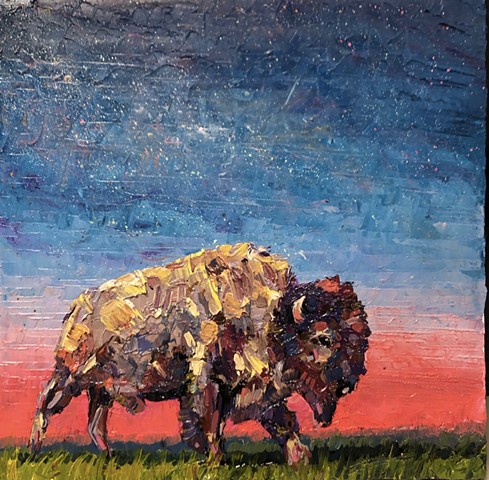 My work seeks to capture that transient energy—the beauty that appears only to vanish moments later. Through paint, I explore how the mundane, the overlooked, or even the “ugly” can become luminous and extraordinary. I am inspired by the life that inhabits this environment: the bison, pronghorn, prairie dogs, and turkey vultures that embody resilience and belonging in an often unforgiving landscape. I also find fascination in the nocturnal world—where the glow of a distant gas station, a flickering campfire, or the vast Milky Way transforms darkness into cinematic wonder.