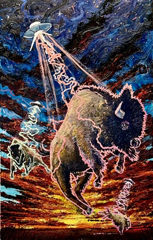 My practice invites viewers into atmospheric worlds charged with both mystery and familiarity—where alien abductions of bison, fiery plains sunsets, and quiet, hallucinatory moments coexist. These images are not just depictions of place but reflections of presence and perception, of being still enough to witness the earth breathe.