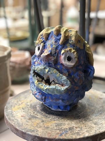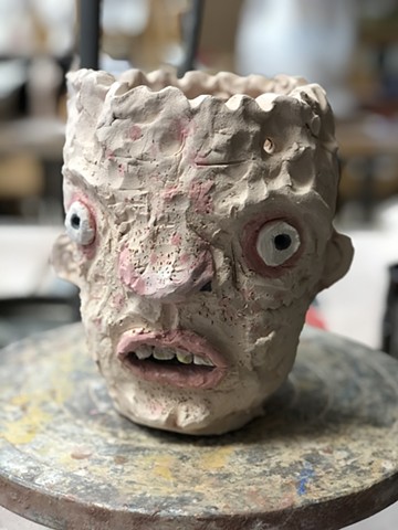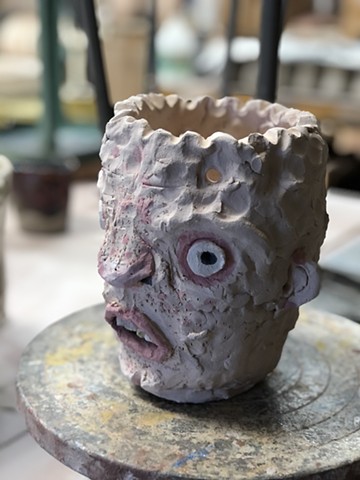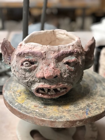 Each piece takes about ninety minutes to build. I lean into the rough textures and the primitive, exaggerated features, shaping wide, whimsical heads whose potted plants erupt like wild hair—alive, expressive, a little feral. It’s a side practice, a playful detour from my main body of work, and it is wonderfully freeing. The process asks nothing of me but presence and joy.